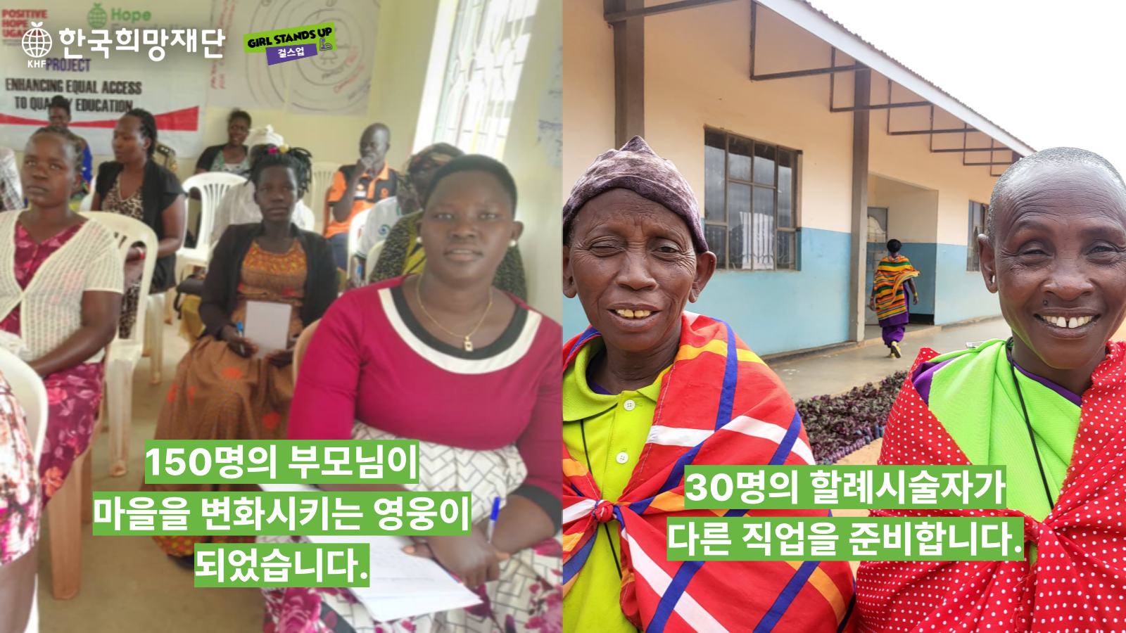 여러분의 후원으로 우간다 람워(Lamwo)구 마디 오페이(Madi Opei)지역에서는 150명의 주민이 마을을 변화시키는 영웅(community change champions)이라는 모임에 들어와, 여아 교육의 소중함을 널리 알려 사람들을 변화시키는 일에 함께하기로 약속했습니다. 탄자니아 엔데베시(Endevesi)지역에서는 30명의 할례 시술자가 다른 직업을 가지려 노력하기로 약속했습니다.