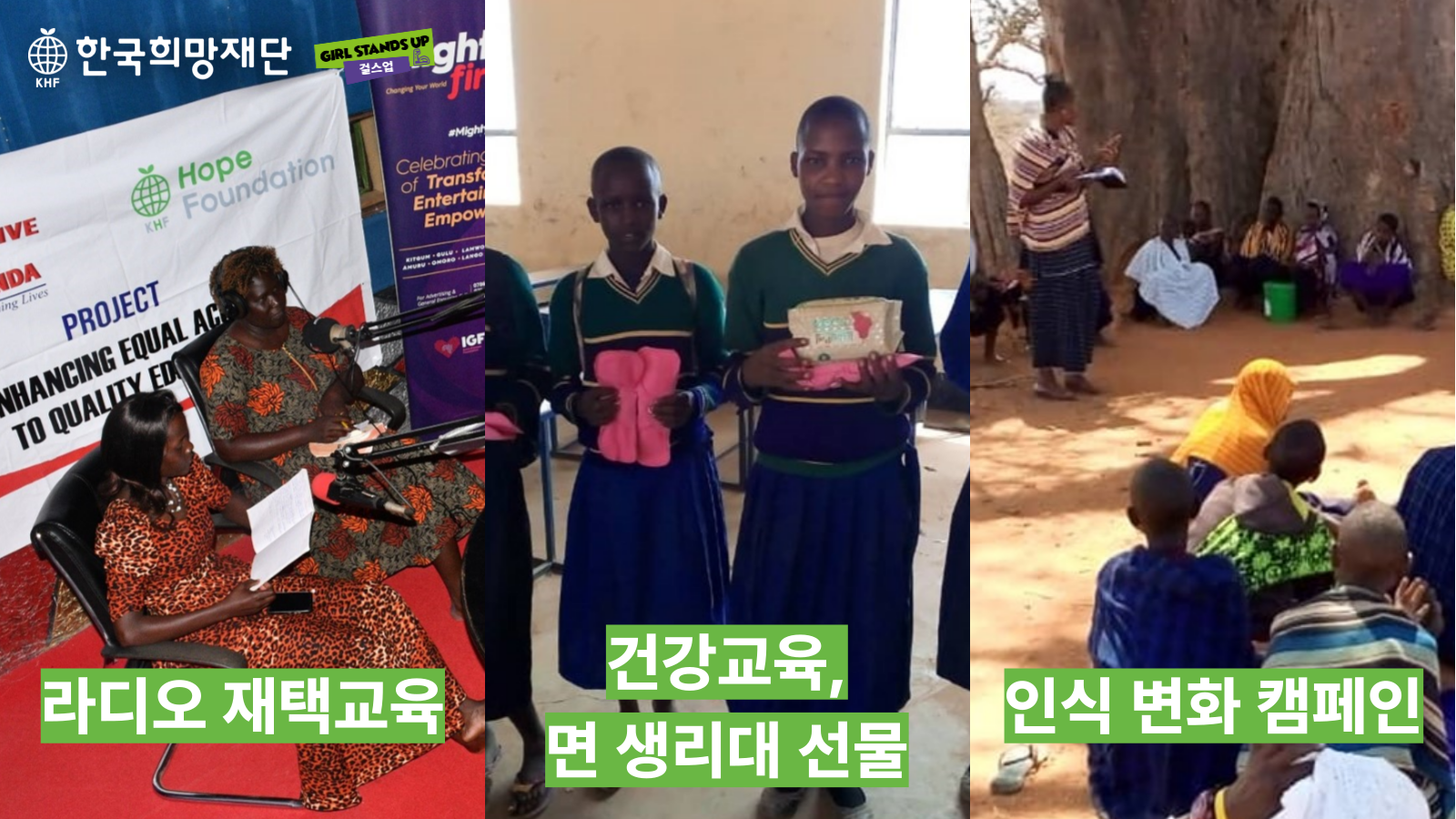 2020년 10월 11일, 세계 여아의 날을 맞아 한국희망재단은 아프리카 여아의 여성할례, 아동결혼, 학업단절을 근절하기 위한 걸스탠즈업 캠페인(약칭 걸스업)을 시작했습니다.