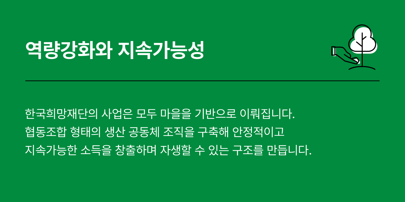 잠재된 힘이 모이고 커질수록, 희망은 현실에 가까워집니다. 그래서 우리는 자립 마을을 만듭니다.